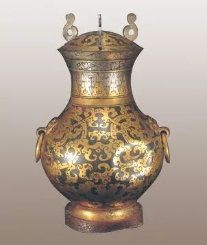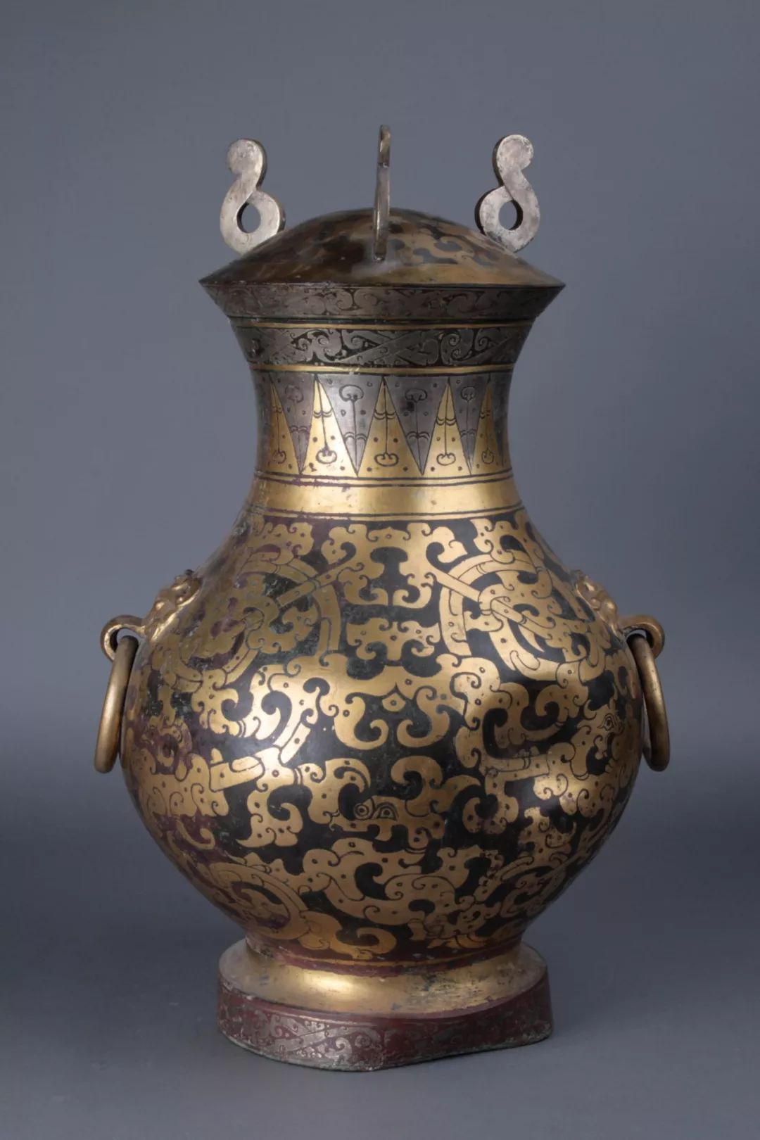 壶通体用鎏金、鎏银工艺装饰。口部和圈足饰鎏银卷云纹带,颈部饰金银相间的三角纹带,腹部饰四条独首双身的金龙相互翻卷蟠绕,并缀以金色卷云纹。铺首鎏金。盖面饰鎏金夔凤,盖缘饰鎏银卷云纹,卷云纽鎏银。纹饰金银相映,富丽堂皇。壶内壁髹朱漆一层。壶底刻铭文:“楚大官,槽,容一石,并重二钧八斤十两,第一”。当代的能工巧匠巧妙地利用了金银的色差,将构图的复杂和色调的平衡结合得异常完美,现代工匠看到我,想必也是要赞不绝口。