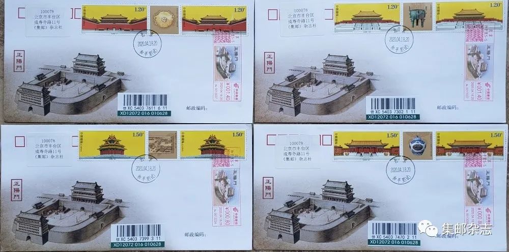 2020年是明代北京城建成600年,《集邮》杂志社特使用《故宫博物院》邮票及“正阳门”邮资机宣传戳,制作纪念封一套4枚。实寄封盖销新式试验日戳。