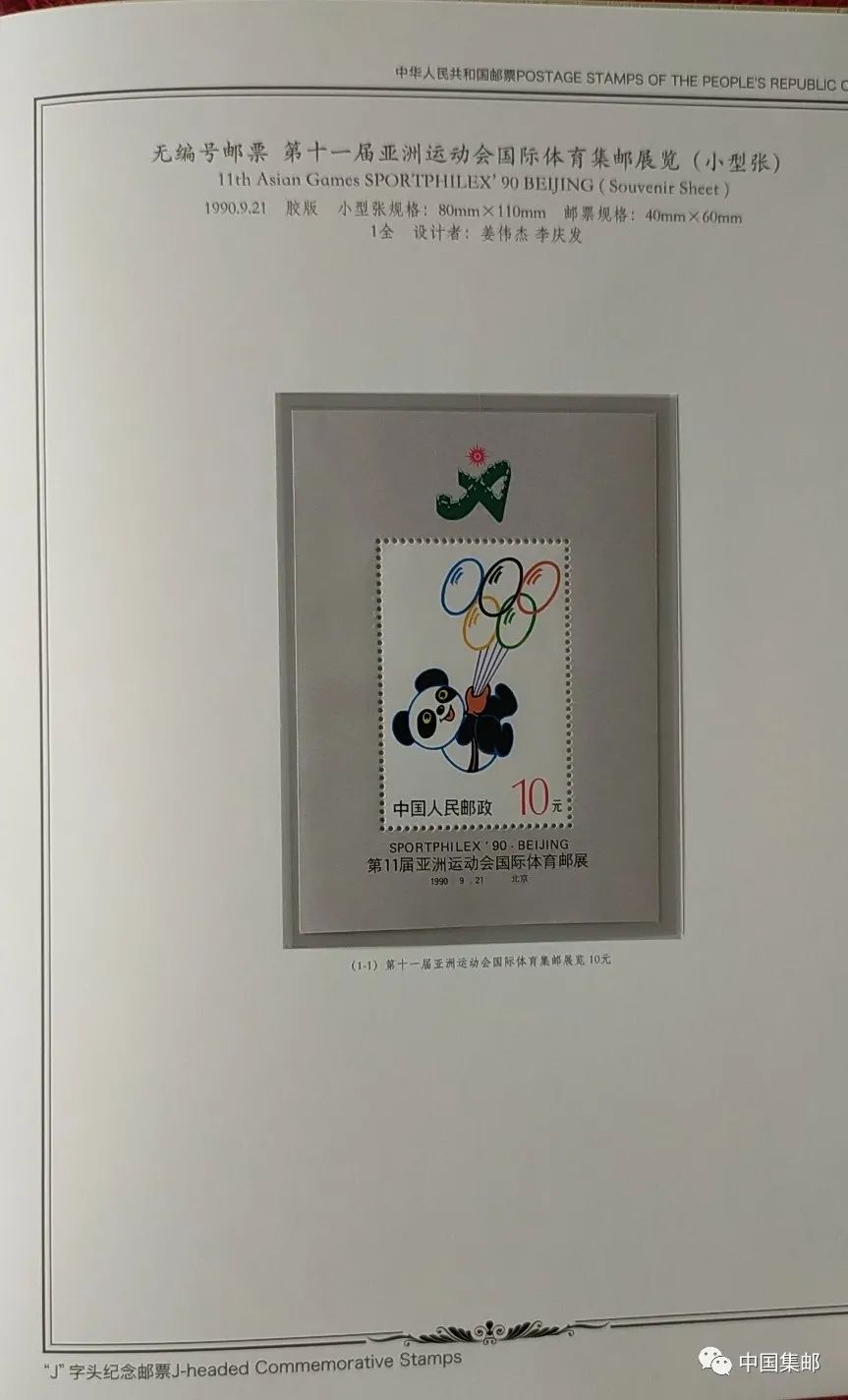 “在1990年北京第十一届亚运会期间我国发行了一枚无编号的邮票(小型张)。由于到目前为止这种无编号邮票只此一枚,本目录没有单独作为一类,权且将它归入第七部分‘J’字头纪念邮票,特此说明。”