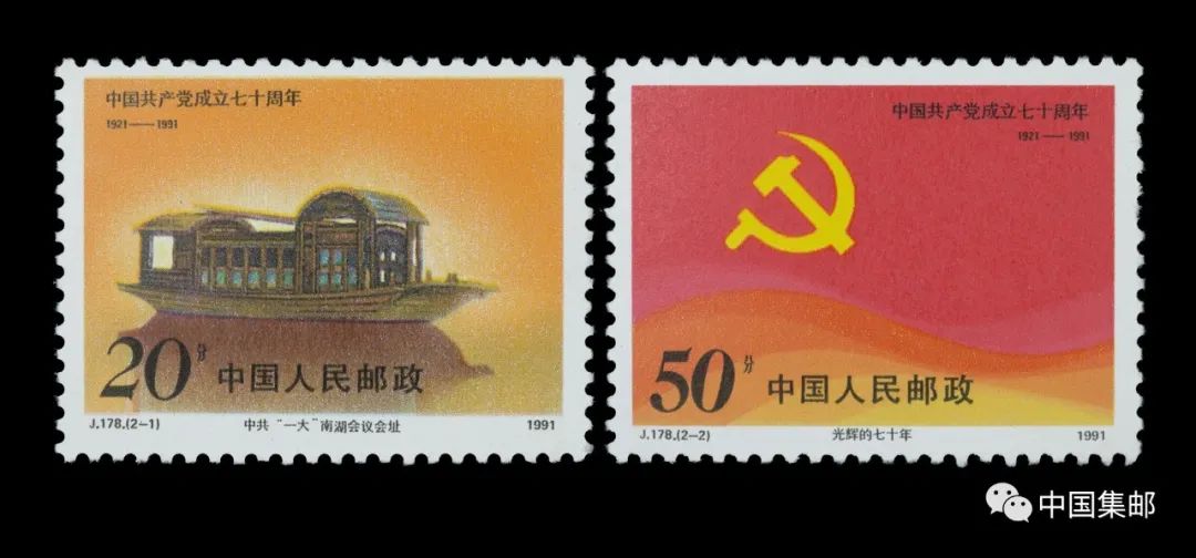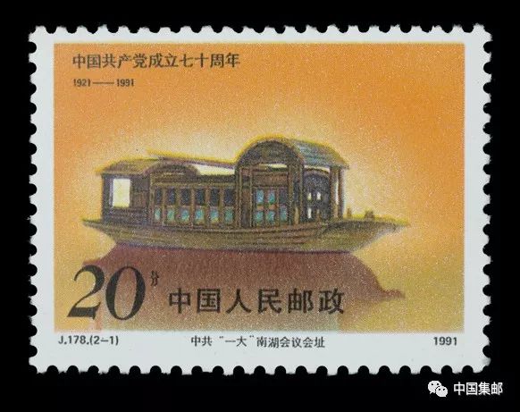 1921年7月,中共“一大”在上海秘密举行。由于突遭法国巡捕搜查,会议被迫休会。从上海乘火车转移到嘉兴,在南湖的一艘游船上完成了大会议程,宣告了中国共产党的诞生。南湖红船除了上文提到的2011年之外,也曾在1991年登上了建党题材的邮票。