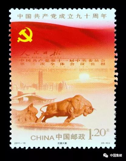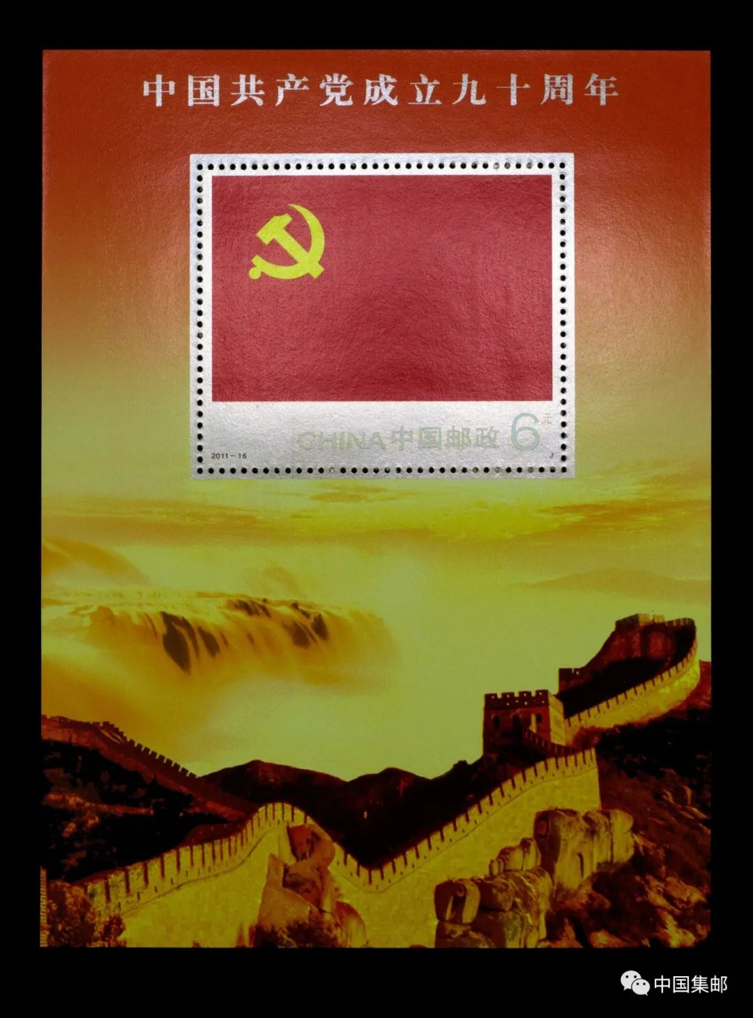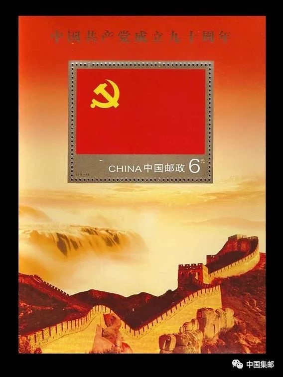 中国共产党党徽为镰刀和锤头组成的图案,党旗则是缀有金黄色党徽图案的红旗。党徽和党旗作为一个政党的代表图案,在建党题材的邮票上屡见不鲜。这里我们只选择作为主要图案出现的邮票展现给大家。