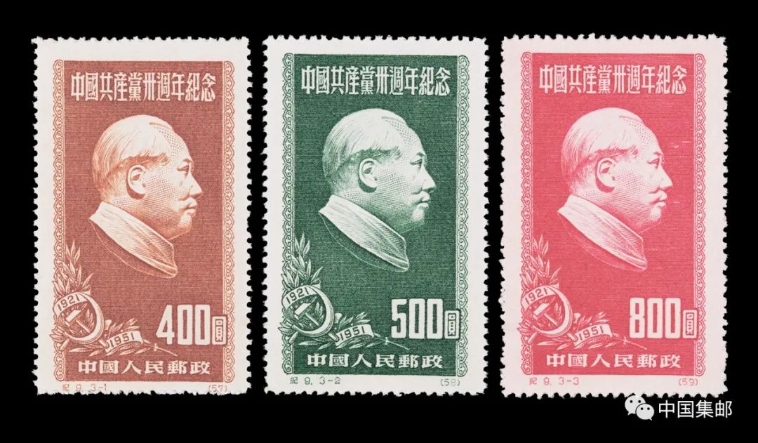 此类邮票在建党节系列中,仅见于1951年7月1日发行的《中国共产党三十周年纪念》邮票,全套3枚同图,面值和颜色不同。图案为毛主席右侧面石膏浮雕头像,左下角附以橄榄枝和党徽。