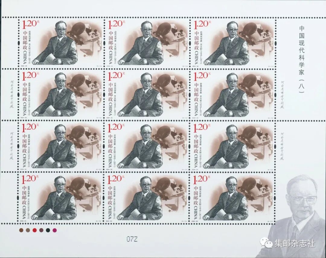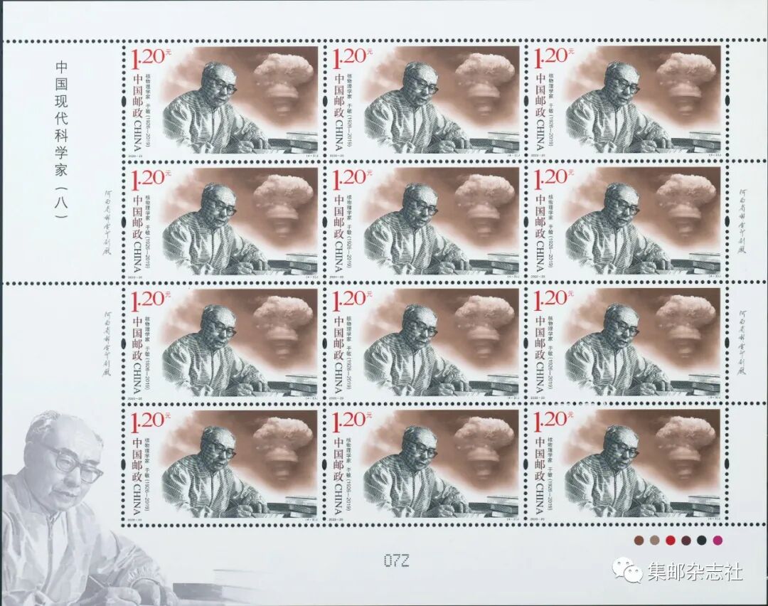 于敏,核物理学家。解决了我国氢弹原理突破中一系列的基础问题,长期领导核武器理论研究和设计,对我国核武器进一步发展到国际先进水平作出了重要贡献。该枚邮票背景为我国第一颗氢弹试验成功画面。