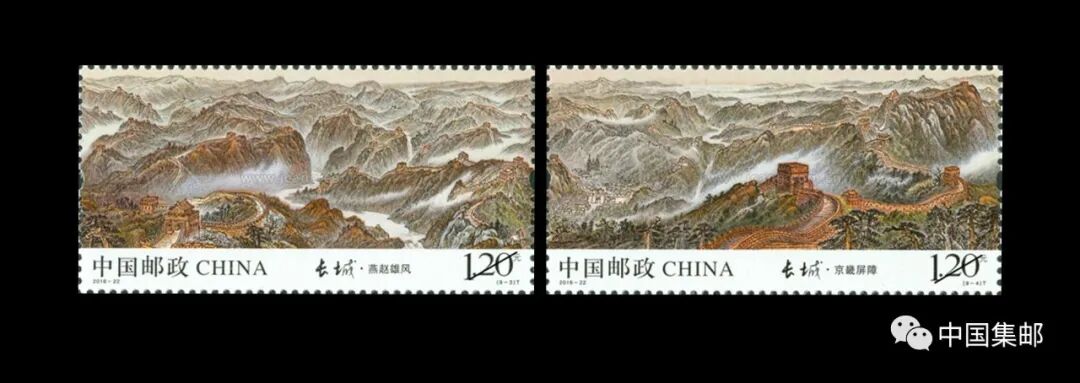 长城是中国的象征,是人类文明史上的伟大建筑工程。以万里长城为题材的邮票不胜枚举。普29《万里长城(明)》系列普通邮票从1997年发行至1999年,共21枚。邮票以明代具有代表性的关隘为画面,再现了长城苍凉古朴的历史风貌,其中八达岭、居庸关、古北口、慕田峪长城等都是北京的著名长城景区。2016年发行的《长城》特种邮票由画家许仁龙执笔、张济平协助创作,历时7个月完成,原作长6.48米。该套邮票以九图连票的形式全景展现了明代长城沿线的自然风貌和人文景观,局部细腻严谨、整体大气磅礴,表现了长城气势之雄伟,历史之悠久。其中邮票第三图“燕赵雄风”主要展现了北京慕田峪、司马台长城,第四图“京畿屏障”则重点展示了“万里长城第一楼”的北京八达岭长城的北四敌楼。在此套邮票发行前夕,位于八达岭上的长城主题邮局成立。