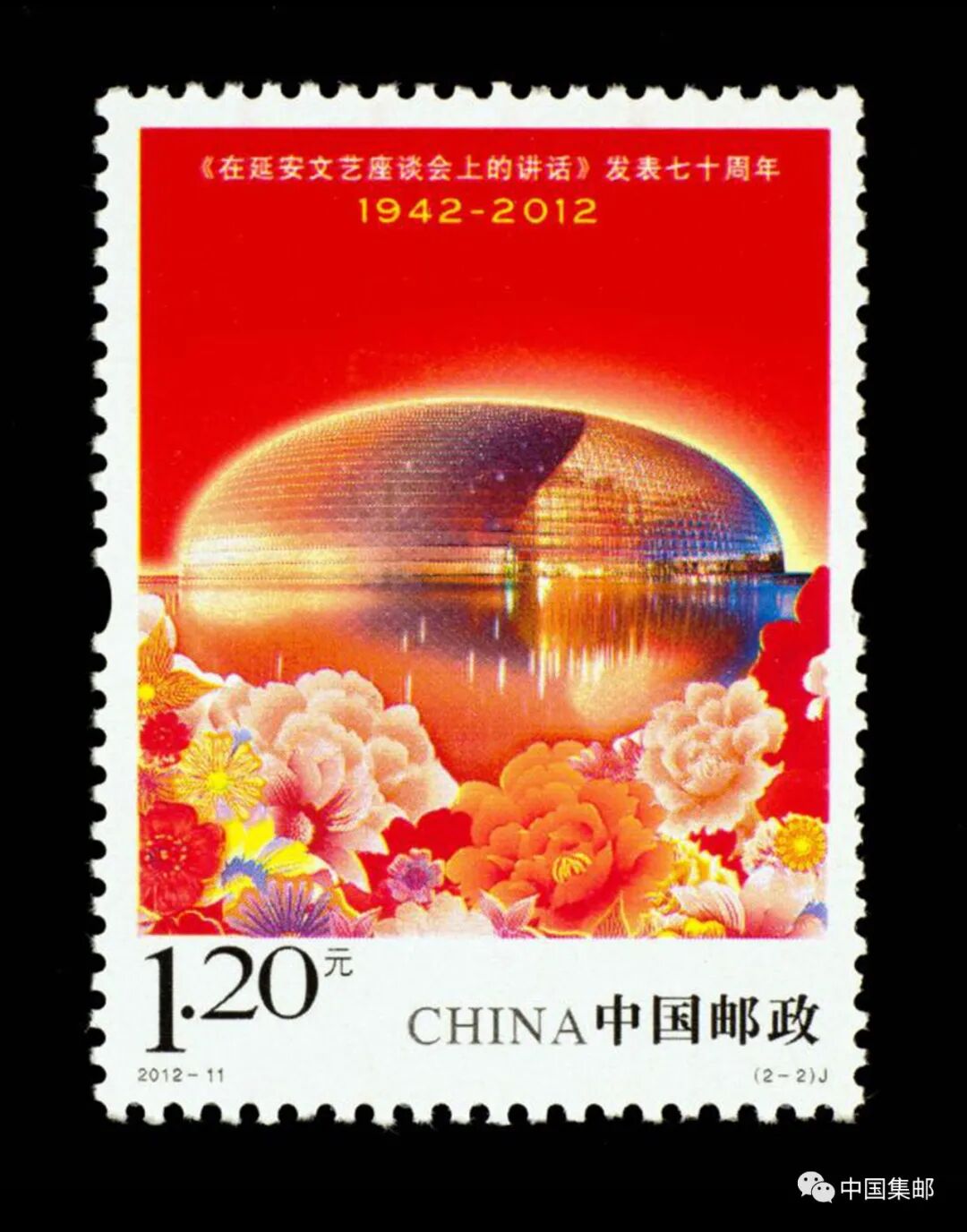 国家大剧院是新北京的地标性建筑之一,外观呈半椭球形,设有歌剧院、音乐厅、戏剧场等。国家大剧院造型新颖、前卫,构思独特,被誉为“城市中的剧院、剧院中的城市”。2012年发行的《<在延安文艺座谈会上的讲话>发表七十周年》邮票第二枚“文艺发展繁荣”中,国家大剧院建筑在百花拥簇中,寓意文化的百花齐放。整套邮票采用以图形和概念设计相结合的处理原则,既有现代图形元素,也包含概念设计的内容,如国家大剧院就完全运用了写实影像的办法处理生成。花朵部分采用了相对装饰性的、概括的设计语言,形成对比与反差,以达到更加细致、鲜艳与突出的艺术效果。
