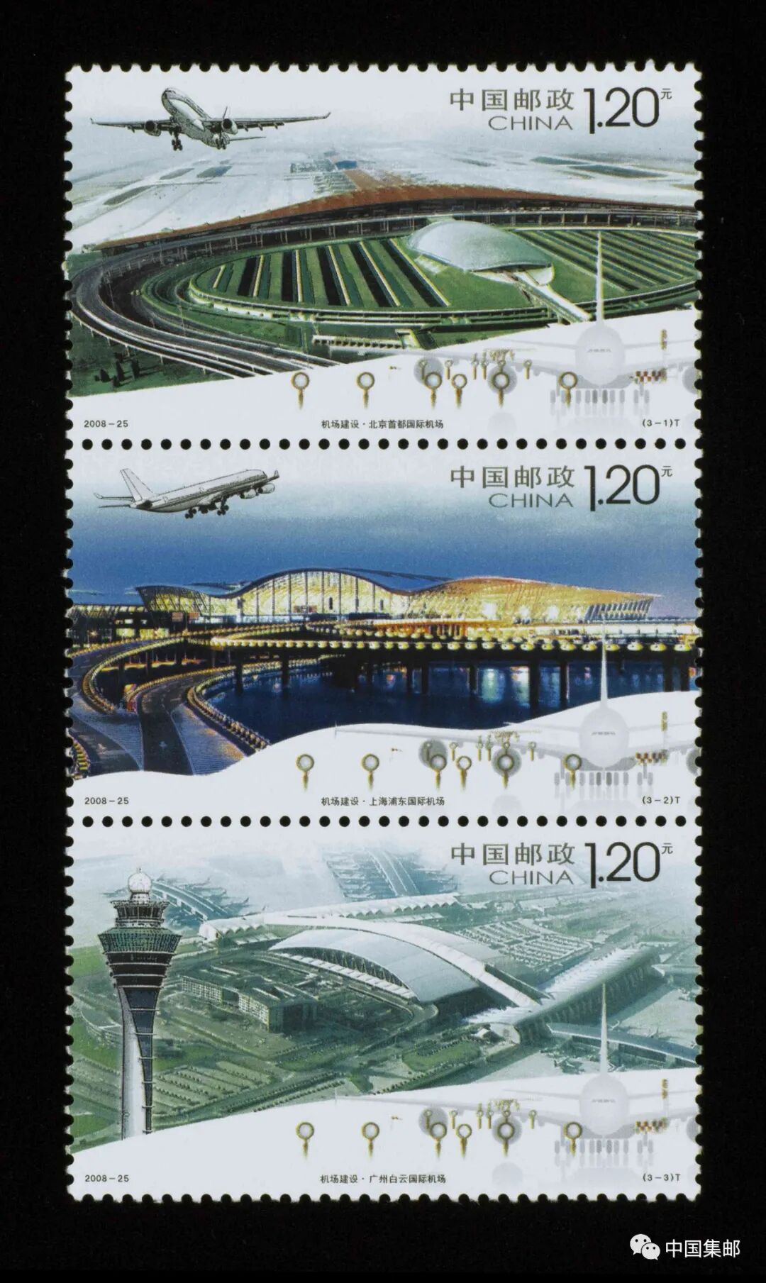 北京首都国际机场曾三次登上方寸,分别是1959年发行的特34《首都机场》、1980年发行的T.47《首都国际机场》和2008年发行的《机场建设》邮票。《机场建设》邮票第一枚图案是北京首都国际机场3号航站楼的俯视图,展现了其似红色巨龙的建筑外观。