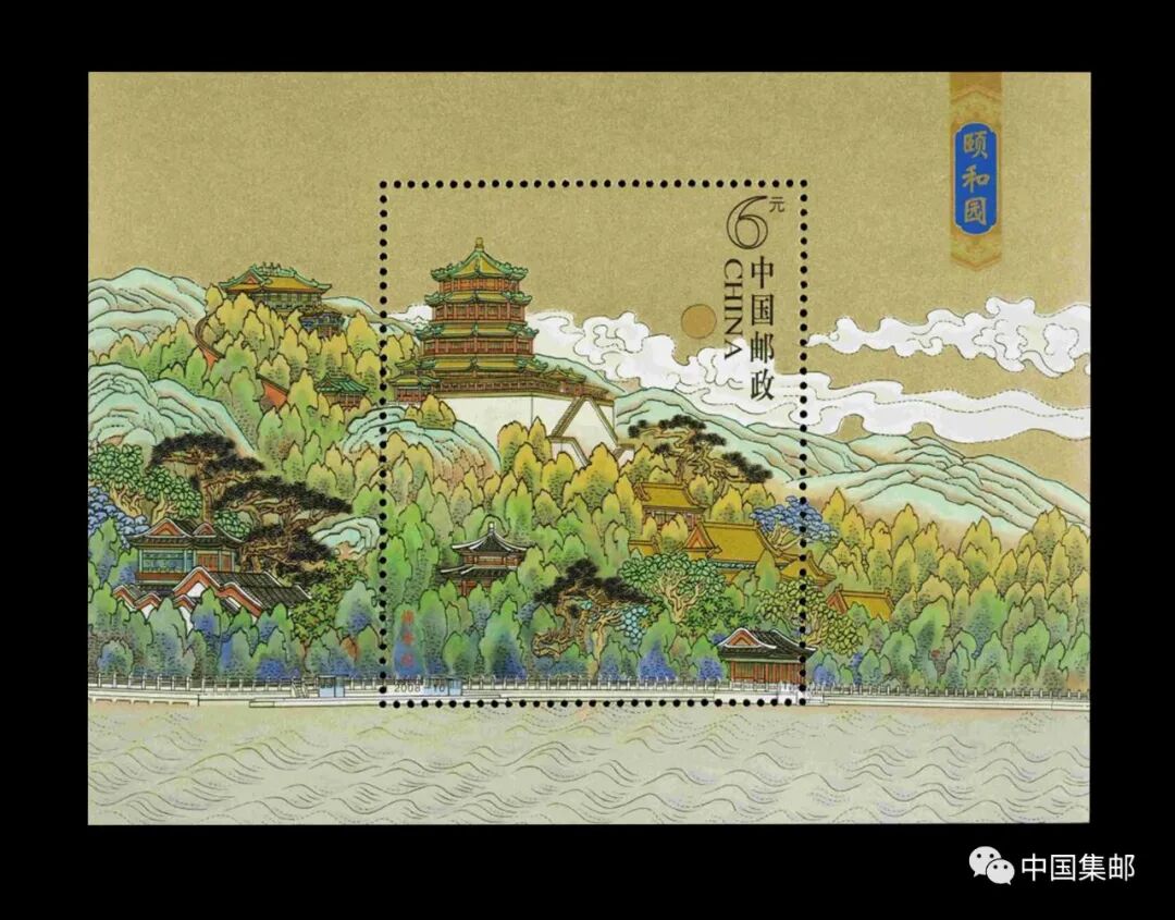 颐和园位于北京西北,原名清漪园,是我国现存规模最大、最完整的清代皇家园林。颐和园集传统造园艺术之大成,她的倩影不止一次出现在新中国邮票上。2008年发行的《颐和园》邮票是编年雕刻版邮票中的精品,采用传统的工笔重彩画法,展示了这一世界建筑文化中的珍品。6枚邮票和1枚小型张选取的全是人们耳熟能详的园景,如十七孔桥、长廊、石舫、谐趣园、玉带桥、佛香阁等。设计者萧玉田先生在创作中选择新的角度,不落俗套地表现了大家都熟悉的景点,既突出了帝王御苑雍容富丽、恢弘壮美的气派,又展现了古典园林婉约清丽的风姿。并通过四季四时,昼夜晨昏,晴、雪、风、月等自然变化,营造出意境之美。