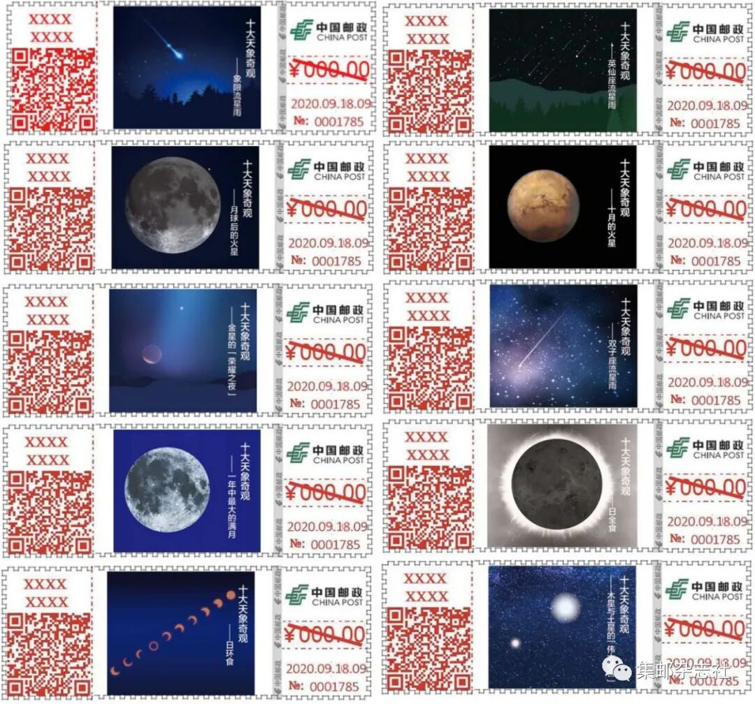 中国邮政将于9月18日在北京市和平里邮政支局启用“十大天象奇观”自助式邮资机宣传戳一组10枚,编号:国2020-10。北京和平里邮局将于2020年9月18日早7:30现场销售“十大天象奇观”自助式邮资机宣传戳纪念封一套10枚,每套售价50元,现场每人一次限购3套,共计900套,售完为止。因受活动现场条件所限,现场不提供自助式邮资机宣传戳加盖服务。同时,和平里邮局还将使用“中国首颗人造卫星发射成功50周年”邮资机宣传戳为公众补资。为了做好疫情防控工作,确保销售安全,请到现场的集藏爱好者自觉佩戴口罩,配合现场工作人员做好测量体温等疫情防控工作,有序排队,按限量购买并提前确定付费(微信或支付宝)结算方式,以便于提高销售效率。