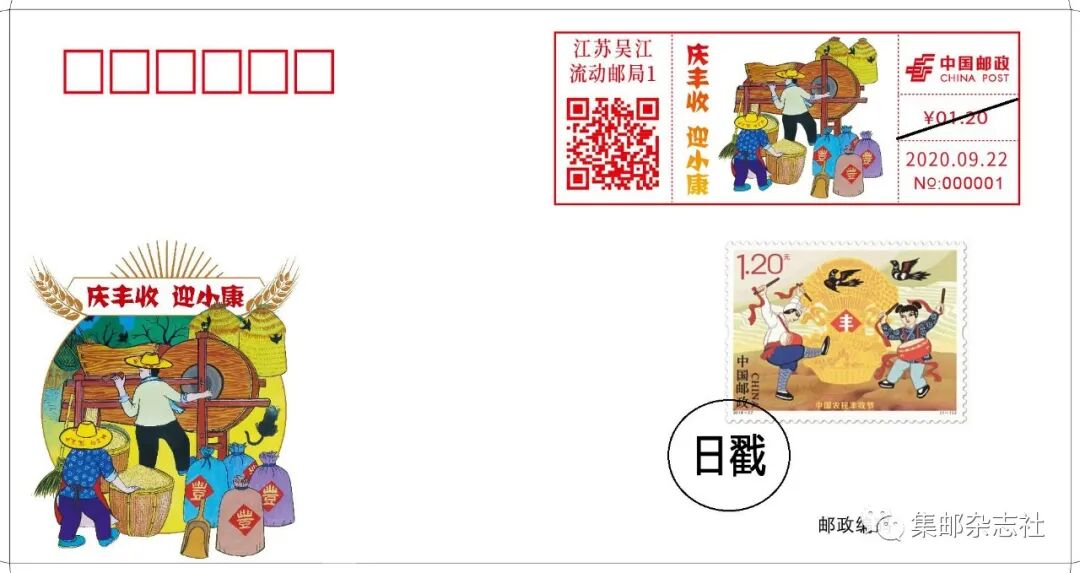 经中国邮政集团有限公司批准,江苏吴江流动邮局将于9月22日启用“庆丰收 迎小康”邮资机宣传戳一枚。该枚邮资机宣传戳由周鑫华设计,周鑫华系非物质文化遗产——吴江农民画、吴江灶画的传承人。