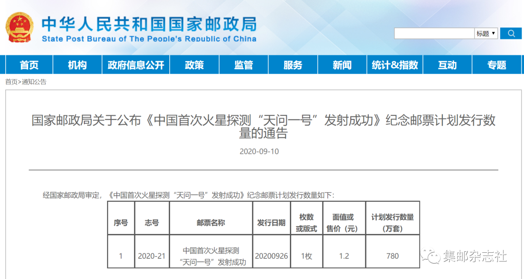 据国家邮政局官网消息,《中国首次火星探测“天问一号”发射成功》纪念邮票将于2020年9月26日发行,该套邮票全套1枚,面值1.20元,计划发行数量780万套。