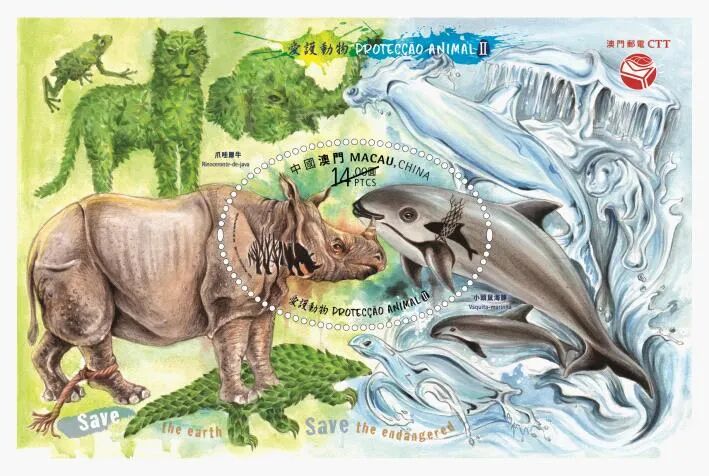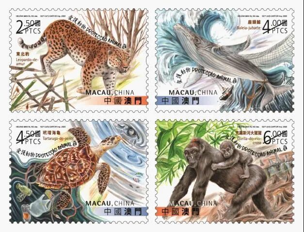 10月9日,发行《爱护动物 (二)》邮票一套4枚,图案及面值分别为: 东北豹(2.50元),座头鲸(4元),玳瑁海龟(4.50元),克罗斯河大猩猩(6元)。同时推出小型张1枚,图案以爪哇犀牛与小头鼠海豚为主图,面值14元。