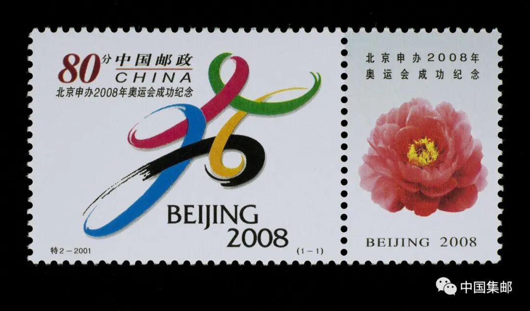 2001年7月13日夜,北京获得2008年奥运会主办权,举国为之欢腾。7月14日,采用特殊编号“特2”的《北京申办2008年奥运会成功纪念》发行。邮票在设计上采用了独特的主票和附票相连的形式,主票图案为北京申奥标志,副票为雍容华贵的牡丹花。
