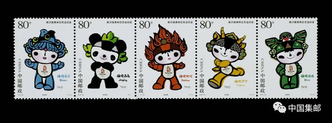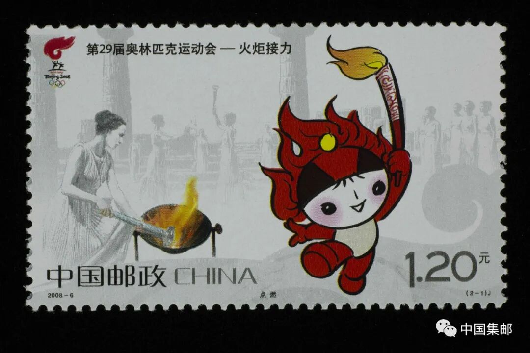 这枚邮票以古希腊奥林匹亚遗址的雅典女祭祀点燃火炬为背景,手持火炬的福娃“欢欢”如同火簇一般向人们奔来,十分俊俏可爱。