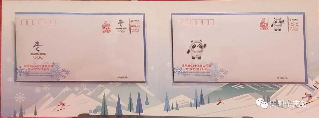 此次启用的“北京冬奥倒计时500天”邮资机宣传戳一组2枚,图案分别为北京2022冬奥会徽和北京2022冬奥会吉祥物。