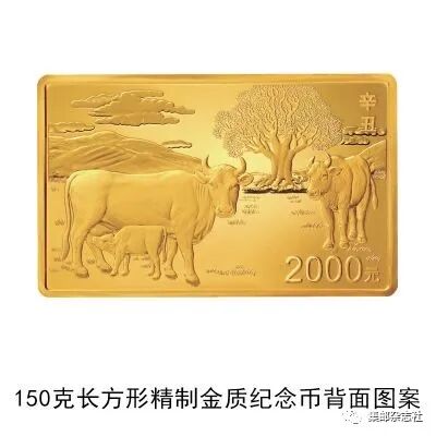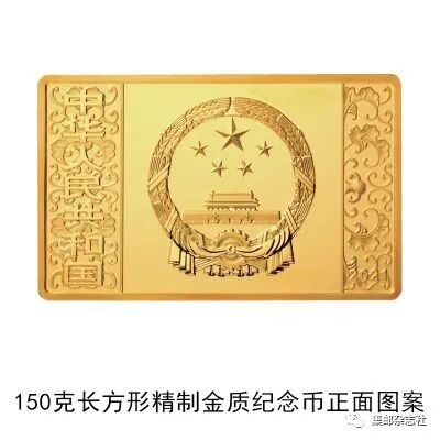 (五)150克长方形金质纪念币为精制币,含纯金150克,规格64毫米×40毫米,面额2000元,成色99.9%,最大发行量600枚。