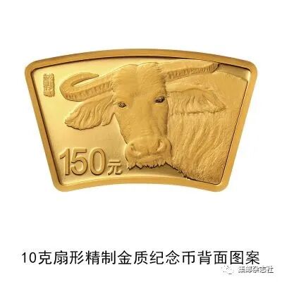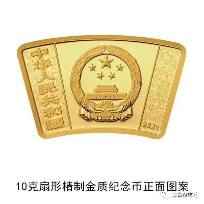 (八)10克扇形金质纪念币为精制币,含纯金10克,外圆半径51毫米,内圆半径36毫米,圆心角30度,面额150元,成色99.9%,最大发行量10000枚。