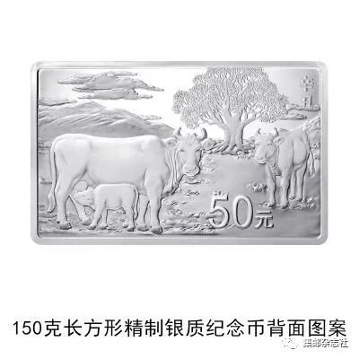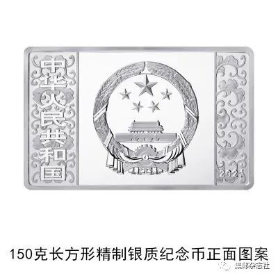 (十一)150克长方形银质纪念币为精制币,含纯银150克,规格80毫米×50毫米,面额50元,成色99.9%,最大发行量5000枚。