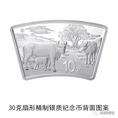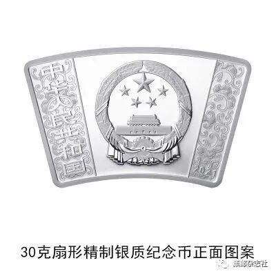 (十四)30克扇形银质纪念币为精制币,含纯银30克,外圆半径85毫米,内圆半径60毫米,圆心角30度,面额10元,成色99.9%,最大发行量30000枚。