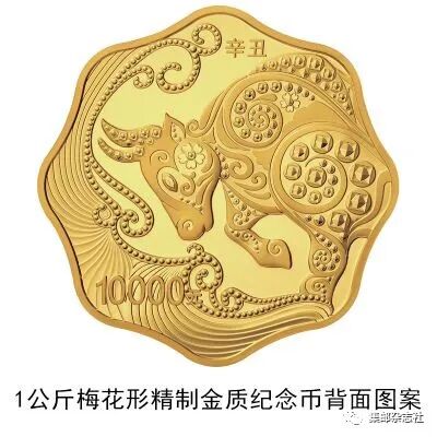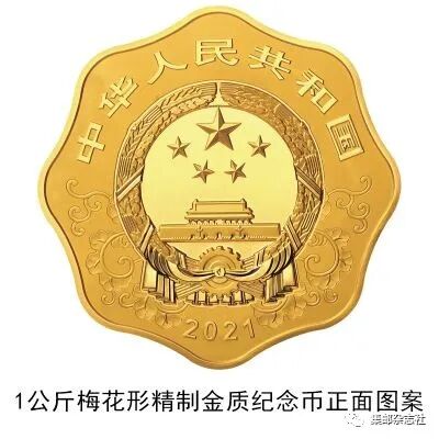 (三)1公斤梅花形金质纪念币为精制币,含纯金1公斤,外接圆直径100毫米,面额10000元,成色99.9%,最大发行量118枚。