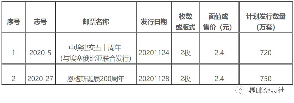11月16日,国家邮政局在其官网上公布了《中埃建交五十周年》和《恩格斯诞辰200周年》两套纪念邮票计划发行数量,详情如下。