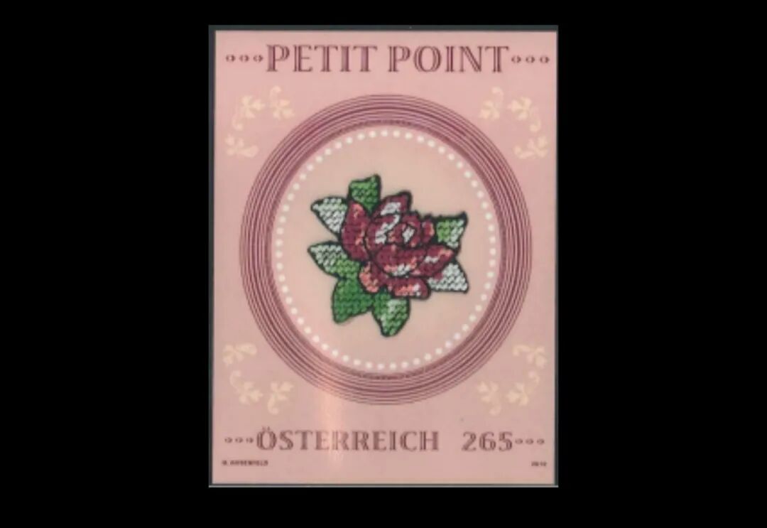 2010年奥地利邮政发行“Petit Point”(“纳纱绣”)刺绣邮票,堪称刺绣邮票的升级版。“Petit Point”是刺绣的一种,最大的特点是针脚极为细小,绣品精致美观。此类绣品是18世纪奥地利上流社会热捧的艺术品,也是奥地利的文化遗产。这枚刺绣邮票的图案为玫瑰,色彩比奥地利的前两套刺绣邮票更加艳丽,邮票中间打有圆形齿孔。