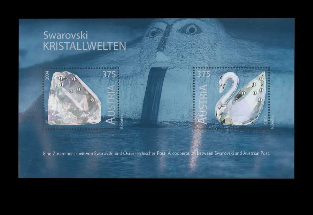 2004年,奥地利邮政与珠宝商施华洛世奇公司合作发行世界首枚水晶邮票小型张,名为《施华洛世奇—邮票上的水晶》。小型张内含两枚邮票,图案分别是宝石和天鹅造型水晶摆件,宝石上端和天鹅尾部共镶嵌12颗水晶。面值7.5欧元,发行量80万枚。这套邮票不仅是珠宝工艺与邮票印制技术的结合,也是天鹅艺术与璀璨水晶的完美结合。邮票上的水晶采用特殊工艺压制在邮票纸基表面,以使在信件分拣过程中不致损坏。相信当友人收到信件时,一定会被邮票上的这些blingbling的水晶所吸引,感受到十足的心意和惊喜。