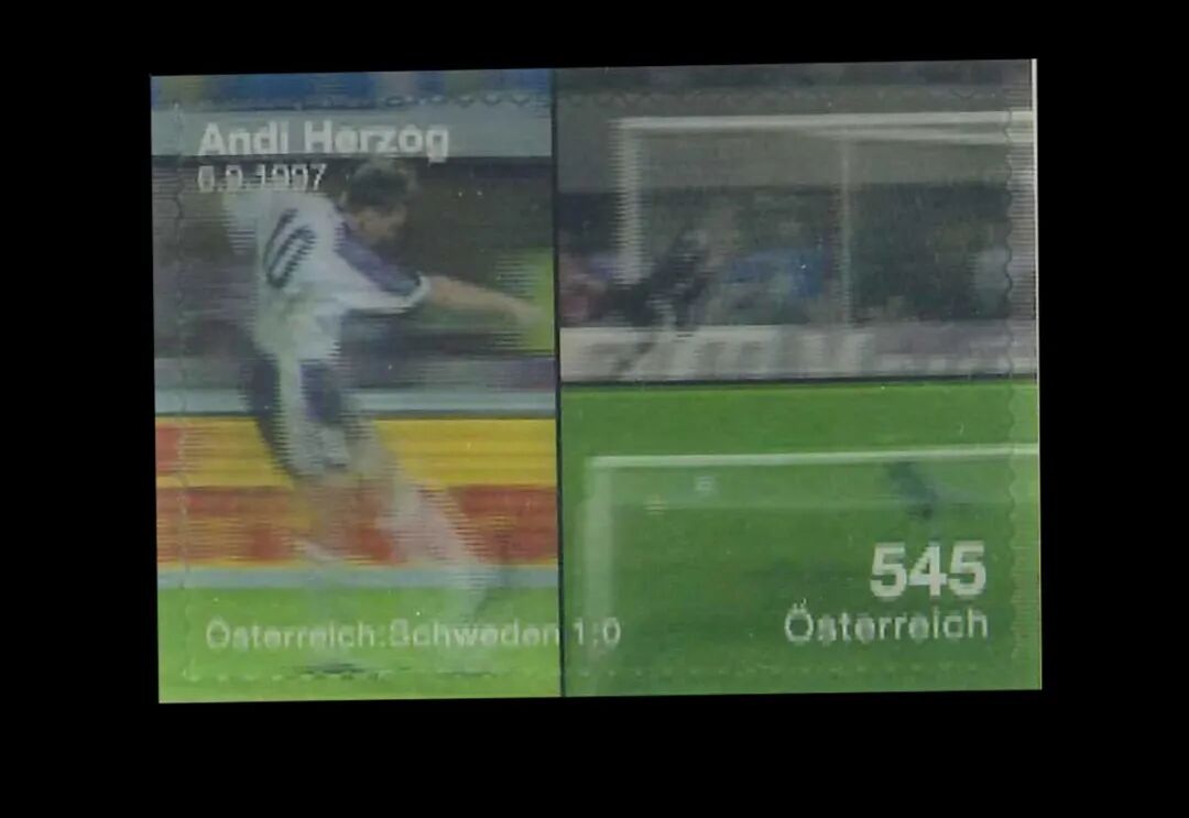 2008年5月,奥地利邮政曾为奥地利著名球星安迪·赫尔佐格(Andi Herzog)发行一枚光栅邮票。邮票展示了他从射门到进球的完整画面,以方寸之地永久地保留下了这个精彩瞬间。