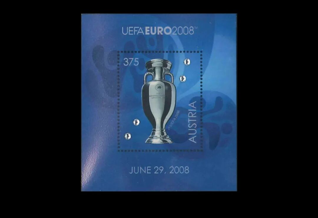 2008年,奥地利邮政再次展现出他们对于水晶材质的偏爱,在《2008年欧洲杯》小型张上镶嵌了4颗水晶。在状如雨滴的水晶衬托下,外形别致的德劳内杯更显优雅与珍贵。