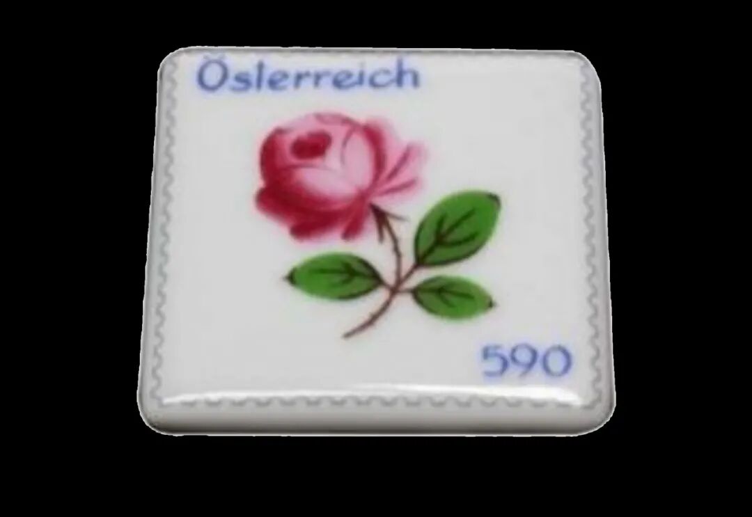 陶瓷也能做邮票吗?答案是肯定的。奥地利邮政于2004年发行的陶瓷邮票选用维也纳玫瑰为图案,由当地著名的奥格腾陶瓷厂(Augarten Porcelain)生产制造。这枚邮票被压成形后,以960摄氏度的高温烧烤24小时以上,再经过上釉和更高温度的烧制以硬化,最终呈现出玫瑰花娇艳美丽的样子。据说,这家陶瓷工厂在创立之初就已开始使用“维也纳玫瑰”作为装饰图案,借助此套邮票的发行不仅展示了精湛的陶瓷烧制技术,也彰显了300多年的建厂历史。