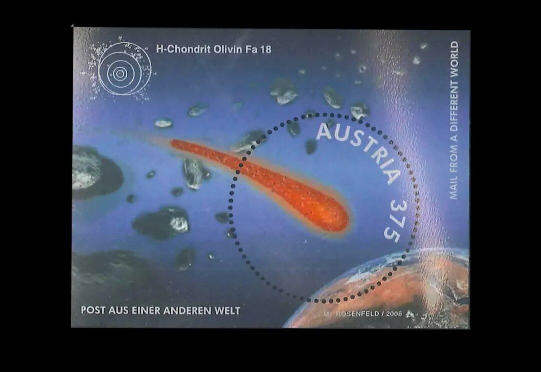 世界上第一枚陨石邮票(含有陨石粉末的邮票)是奥地利邮政发行。2004年,人们在奥地利马洛卡沙漠中发掘了一块疑似在火星与木星之间运行的小流星残体。这枚陨石几乎与地球同龄,属球粒状陨石。2006年,奥地利邮政选取了部分陨石进行研磨,并加入到邮票图案中,打造出世界上第一枚“陨石”邮票。这颗陨石重19公斤,现收藏在奥地利维也纳自然历史博物馆。