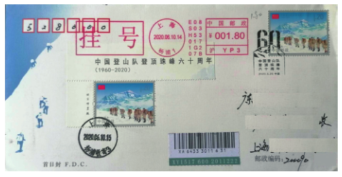 需要特别说明的是,能享受此特殊待遇的首日封必须是中国集邮总公司及各省分公司的首日封。换言之,市、县级邮政部门发行的首日封或者邮人自制的首日封,用邮票发行日期的新邮纪念邮戳盖销邮票后,即使兑付日当天实寄,邮资也是无效的。然而,部分邮政部门在认识和操作上出现了偏差,如图 3、4 是分别从北京和广东深圳寄出的《亚洲文明(一)》兑付日自然实寄封,邮票用5月 15 日的新邮纪念邮戳盖销,信封空白处加盖有6月10日的邮政日戳,贴有平信签条,但当地邮局都没有作欠资处理。更为特殊的是 5 月 25 日发行的《中国登山队登顶珠峰六十周年》纪念邮票,由于印制不及时,该邮票发行首日只在西藏日喀则市面市,其他地方则要到6月10日才兑付。但这次与之前有所不同的是,毕竟邮票首日在西藏投入使用了,是否因为这个原因,中国集邮微信公众号才没有对该票首日封做出处理说明呢?后来,我在网上看到浙江省邮票局转载的《关于〈中国登山队登顶珠峰六十周年纪念邮票〉发行销售方式的公告》中说:“中国集邮总公司及各省分公司发行的该套邮票首日封在6月10日当日实寄,邮票面值仍然有效,无需重新支付邮费。中国集邮总公司首日实寄封寄出日期为 6 月 10 日。”图 5 为从上海寄出的《中国登山队登顶珠峰六十周年》总公司首日封,加盖有 5 月 25 日的新邮纪念邮戳,6 月10 日用邮资机和邮票补资 3 元,邮资合计 4.2 元,为国内 20 克挂号邮资。
