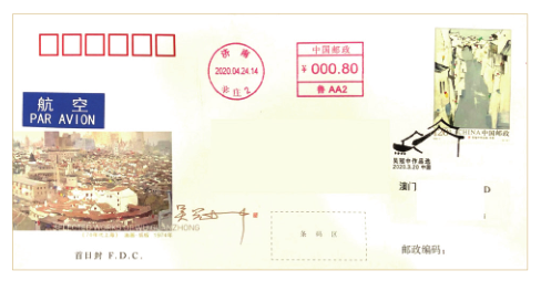 为此,这段时间出现了纪念邮戳和收寄日戳日期不一致的兑付日实寄“首日封”:图 1 为济南寄出的《中国剪纸(二)》总公司首日封,加盖 2020 年 2 月 8 日的新邮纪念邮戳,4月24日邮资机补资0.1元,邮资合计2.5元,为港澳台 20 克平航邮资 ;图 2 为济南寄出的《吴冠中作品选》邮票总公司首日封,加盖 3 月 20 日的新邮纪念邮戳,4 月 24 日邮资机补资 0.8 元,邮资合计 2 元,为港澳台 10 克平航邮资。