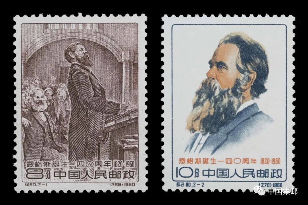 1960年,原邮电部发行《恩格斯诞生一四〇周年》纪念邮票一套2枚。图案选自前苏联著名画家茹可夫的画作。其中第1枚为雕刻版,描绘的是1872年恩格斯在第一国际海牙代表大会上演讲的风貌。在这次会议上,恩格斯严厉批判了巴枯宁派极力鼓吹的无政府主义,宣传捍卫了马克思主义理论。画面中,马克思坐在恩格斯身后,神情专注地听取恩格斯的演讲。第2枚为是恩格斯的一幅画像,采用影写版印刷,色彩鲜明。
