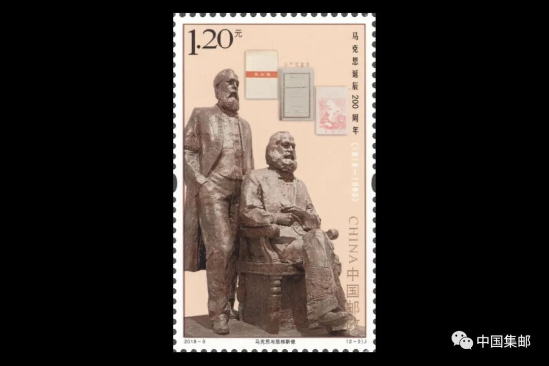 1963年,原邮电部发行的《马克思诞生一四五周年》纪念邮票第3枚描绘了马克思和恩格斯在一起工作的场景。2018年,中国邮政发行了《马克思诞辰200周年》纪念邮票。其中第2枚图案是根据中国美术馆馆长、中国美术家协会副主席吴为山的经典雕塑作品设计的马克思和恩格斯像,反映出两位领袖的革命友谊,背景为《共产党宣言》德文版、中文版以及《资本论》中文版。
