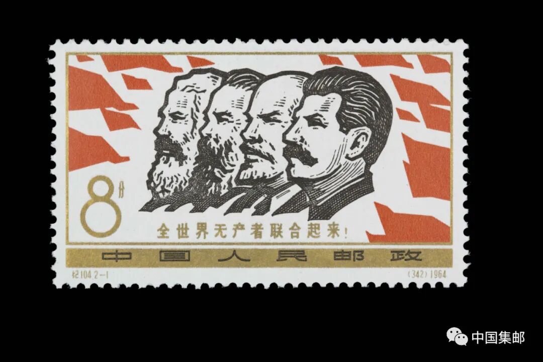 “全世界无产者联合起来”的口号最早由恩格斯在1847年6月共产主义者同盟第一次代表大会上提出,后被写入《共产党宣言》。随着马克思主义的广泛传播,“全世界无产者联合起来”成为了全世界无产阶级共同战斗的口号。1964年5月1日,正值“五一”国际劳动节,原邮电部发行了纪念邮票《全世界无产者联合起来》,第1图画面为红旗簇拥下的马克思、恩格斯、列宁、斯大林像。