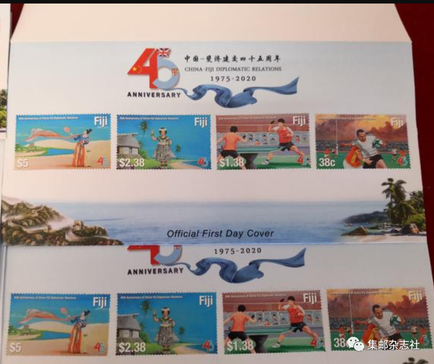 该套邮票是斐济邮政为纪念斐济与中国建交45周年而发行的,邮票邀请斐济当地艺术家普拉温·森设计,融入了鲜明的中斐两国传统服饰及体育元素。斐济教育、文化遗产和艺术部部长罗茜·阿克巴尔在致辞中表示,这套纪念邮票是两国令人骄傲且丰富多彩的文化与传统的象征,也是两国之间牢固政治互信和友好的证明,希望这种友好关系能够继续发展下去。
