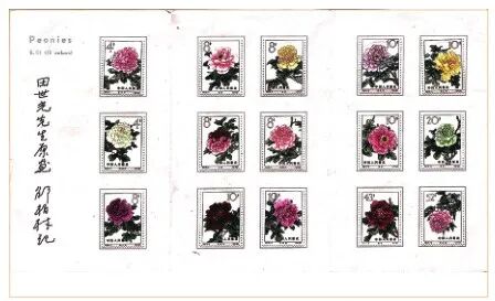 1964 年发行的特61《牡丹》邮票是一套经典邮票,邮票1套15枚和小型张1枚,在1980年举行的中华人民共和国成立30年最佳邮票评选中被评为“最佳特种邮票”,在我国邮票发行史上具有重要的位置。这套邮票和小型张的原图由我国著名工笔花鸟画家田世光所绘,牡丹花的雍容华贵、国色天香跃然纸上。因邮票设计者为邵柏林、小型张设计者为卢天骄,所以我请邵柏林先生为我的《牡丹》邮品签名,他题写了“田世光先生原画邵柏林记”。