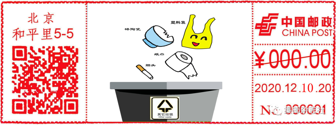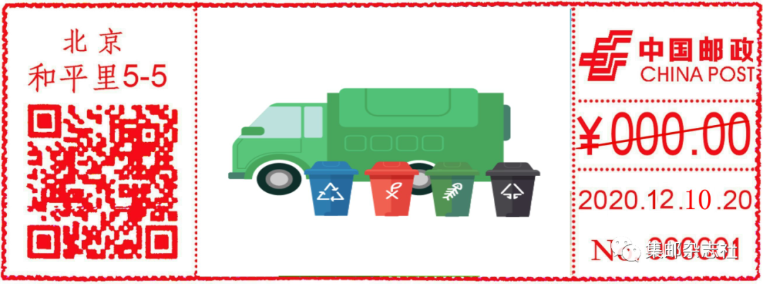 经中国邮政集团有限公司批准,北京和平里邮政支局将于2020年12月10日开始启用以“垃圾分类”为主题的一组邮资机宣传戳。该组邮资机宣传戳共6枚,图案为“垃圾分类”“其它垃圾”和“厨余垃圾”的3枚邮资机宣传戳将率先启用,本组的另外3枚将于2020年12月14日启用。