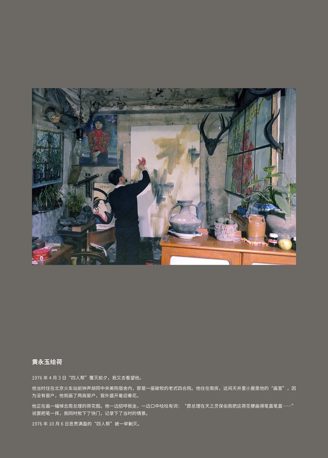 当时黄永玉正在“画室”中专心创作悼念周总理的《荷花图》,口中念念有词:“愿总理在天之灵保佑我把这荷花梗画得笔直笔直……”所谓“画室”就是天井里的小屋,因四面无窗,黄永玉遂画了两扇窗,窗外迎春花盛开。