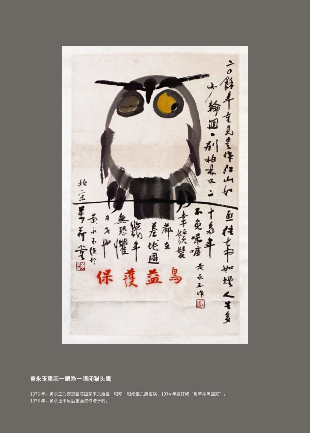 1973年,黄永玉为南京画院画家宋文治画“一眼睁一眼闭”猫头鹰而招祸,1974年被打成“反革命黑画家”。