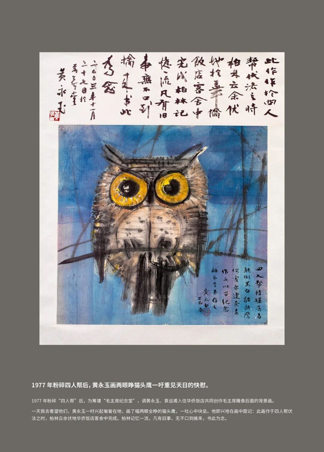 左图:1973年,黄永玉作“一眼睁一眼闭”猫头鹰而招祸。