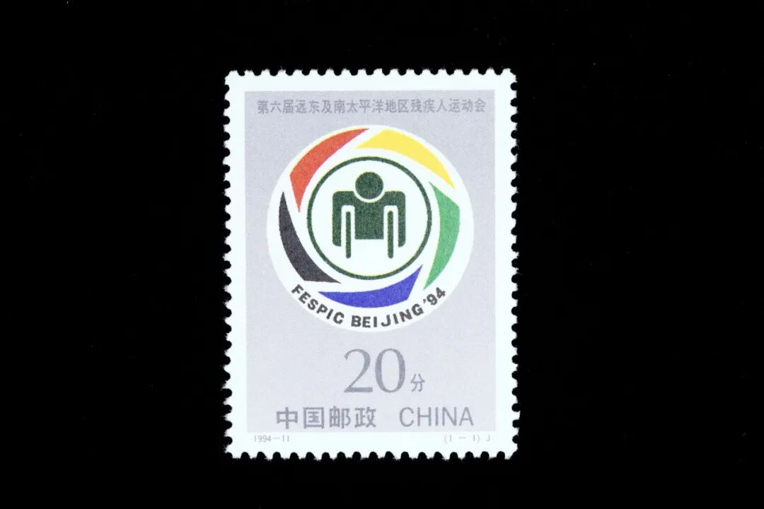 残疾人奥林匹克运动会,是专为残疾人举行的世界大型综合性运动会。1994年9月4日,为祝贺第六届远东及南太平洋地区残疾人运动会在北京举行,邮电部发行了《第六届远东及南太平洋地区残疾人运动会》纪念邮票,全套1枚。邮票图案为第六届远东及南太平洋地区残疾人运动会会徽,用渐变的灰底色作为衬托,在会徽上、下点缀着文字,使画面简洁、明朗、和谐。会徽中间是绿色的残疾人坐在轮椅上的剪影,外面是以奥运五环的颜色组成的滚动的圆环,象征着世界残疾人运动会在奥林匹克精神指引下不断前进。