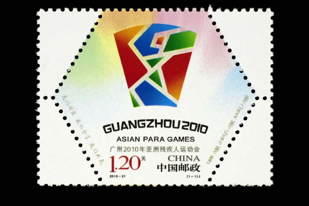 2010年9月3日,广州2010年亚洲残疾人运动会迎来倒计时100天,中国邮政临时增加发行志号为2010-21《广州2010年亚洲残疾人运动会》纪念邮票,全套1枚,面值为1.20元,采用六边形设计,该邮票成为中国历史上首枚六边形邮票。整版邮票为12枚,在边纸上印有本次运动会的比赛项目图标,增加邮票的收藏性和趣味性。邮票的主图是该届亚残会的会徽和中英文口号“我们欢聚、我们分享、我们共赢;We cheer,We share,We win”。会徽创意取材于广州民居的西关花窗,以国际残奥委会会标使用的红、绿、蓝三原色拼出运动的人形,象征残疾人运动员在广州亚残运会上努力拼搏、实现自我。会徽似窗,窗代表家庭,寓意残疾人运动员及残疾人在广州能够感受家庭般的温馨,窗寓意人类心灵之窗,象征了残疾人与健全人心灵相通,共享人类文明进步成果,共同创造美好的未来。