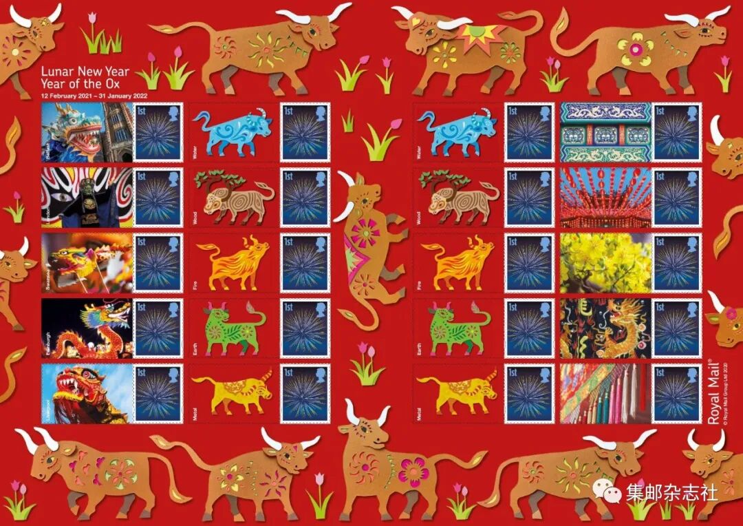 12月8日,英国邮政将发行“牛年”生肖个性化邮票。英国的生肖个性化邮票整版包含20枚邮票,副票图案为”牛“的形象以及舞龙等。