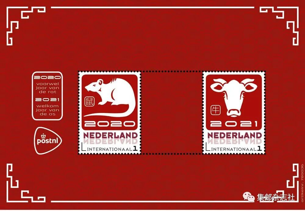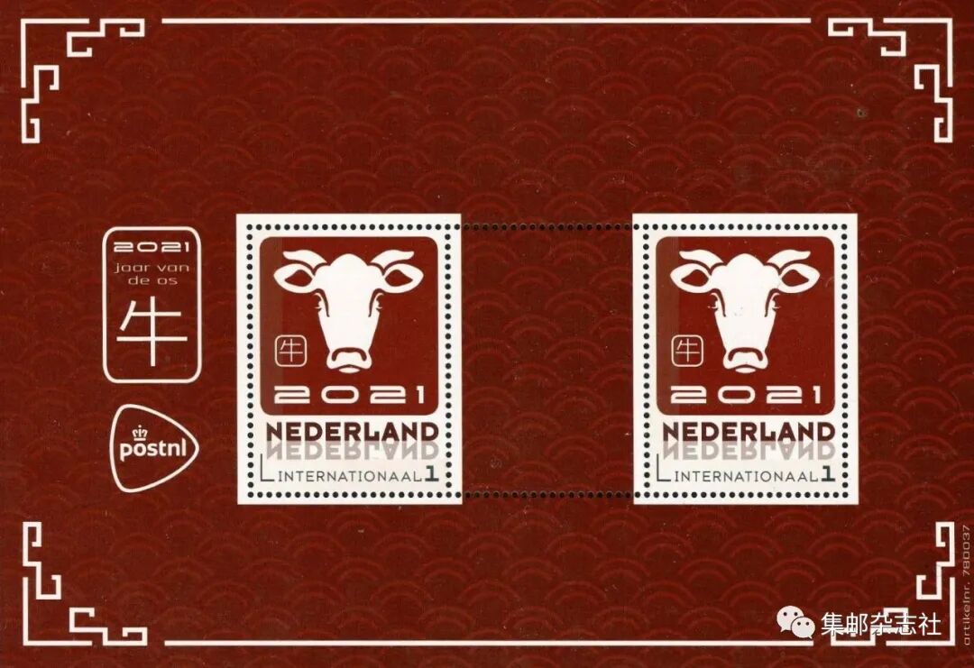 荷兰邮政也于日前公布了将要发行的“牛年”生肖个性化邮票图案。荷兰邮政的“牛年”生肖个性化邮票为两种小全张,一种小全张包含“鼠年”“牛年”个性化邮票各一枚,另一种小全包含两枚“牛年”生肖个性化邮票。
