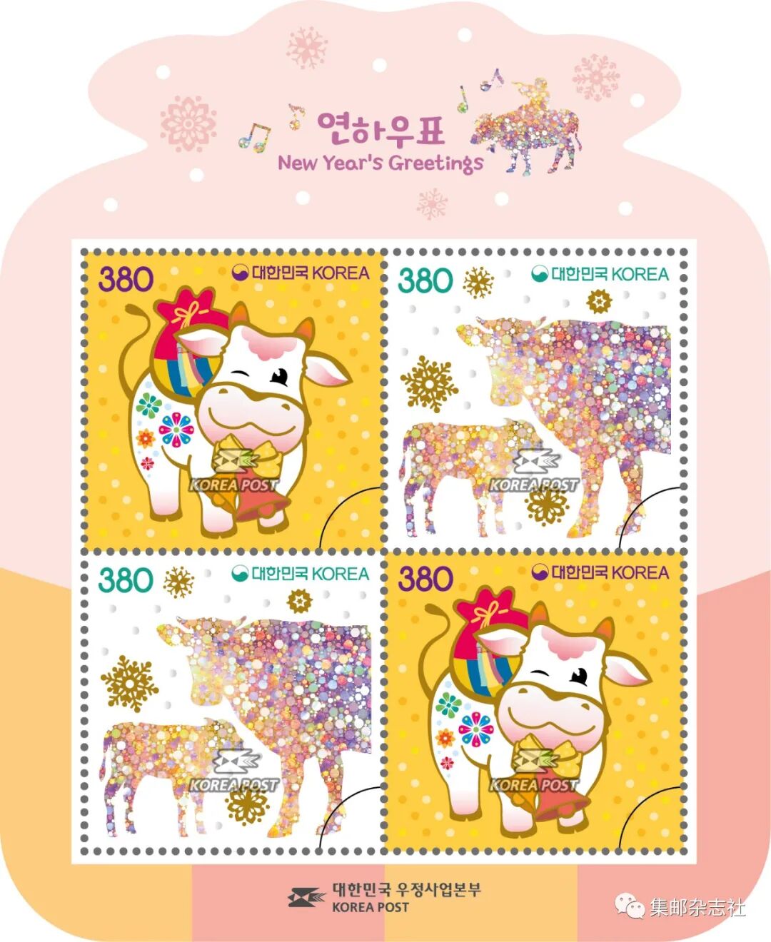 12月1日,韩国邮政发行“牛年”生肖邮票一套2枚,同时发行小全张一枚。图案为卡通牛和牛的剪影。