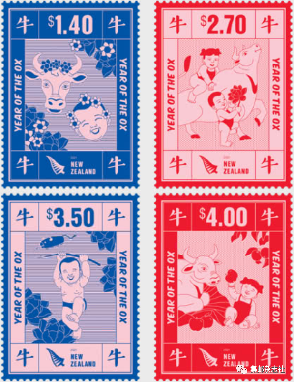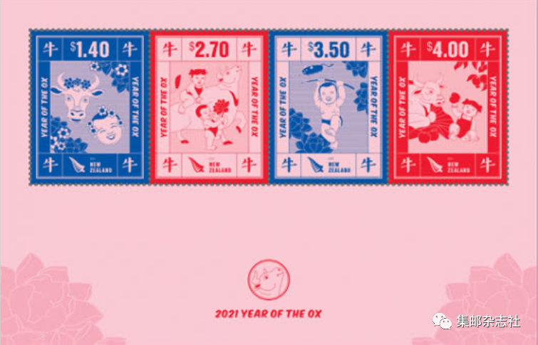 12月2日,新西兰邮政发行“牛年”生肖邮票一套4枚,同时发行小全张一枚,图案为中国年画。