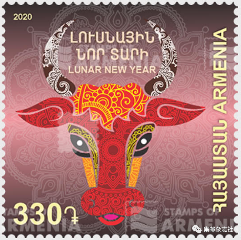 11月13日,亚美尼亚邮政发行“牛年”生肖邮票一套1枚,图案为牛头。整版包含10枚邮票。