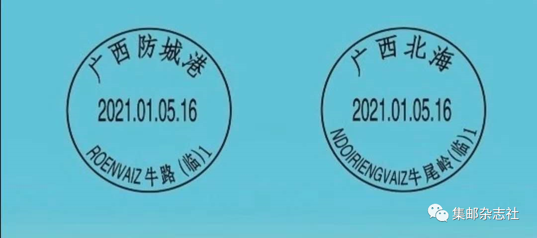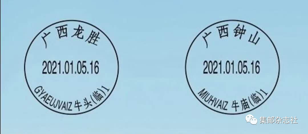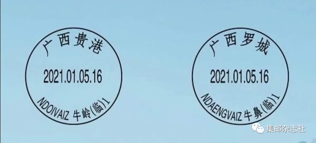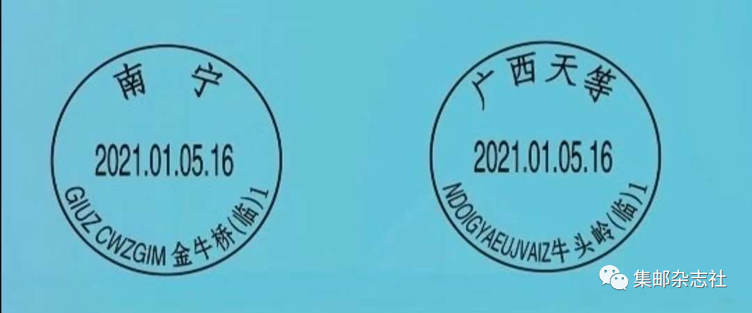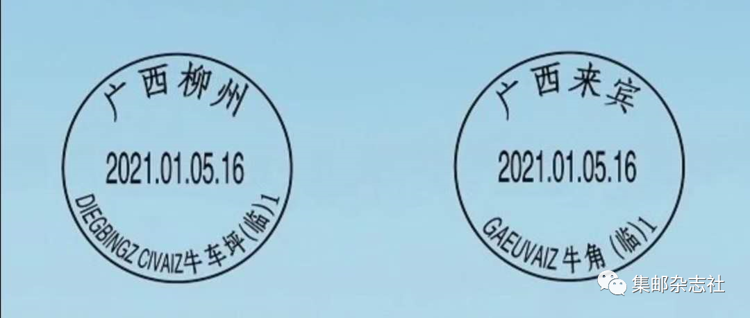 14枚临时日戳分别为南宁市“金牛桥”临时日戳、崇左市天等县“牛头岭”临时日戳、玉林市“大牛窝”临时日戳、钦州市“牛角岭”临时日戳、防城港市“牛路”临时日戳、北海市“牛尾岭”临时日戳、柳州市“牛车坪”临时日戳、来宾市“牛角”临时日戳、梧州市“牛皮巷”临时日戳、百色市隆林县“牛场”临时日戳、贵港市“牛岭”临时日戳、河池市罗城县“牛鼻”临时日戳、桂林市龙胜县“牛头”临时日戳、贺州市钟山县“牛庙”临时日戳。本次启用的14枚临时日戳均为双文字日戳。