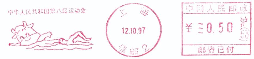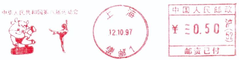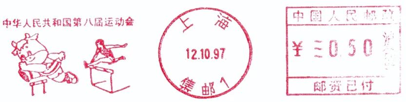 1997年为丁丑(牛)年,第八届“全运会”于1997年10月在上海市召开,于是吉祥物便以牛年画牛为设计思路,取“初生牛犊不怕虎”之意,采用了卡通绘画风格设计而成了“圆圆”。1997年10月12日,上海市邮政启用了“中华人民共和国第八届运动会”邮资机宣传戳10枚,宣传戳主图为吉祥物“圆圆”展现的10个运动项目(图9~18)。